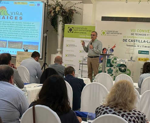 Bienvenido Amorós, Técnico Vitivinícola de Cooperativas Agroalimentarias Castilla-La Mancha (CACLM), presentó en la VII Convención de Técnicos y Técnicas de CACLM el proyecto del Grupo Operativo Viña-Raíces, centrado en el manejo de cubiertas vegetales en viñedos situados en ambientes semiáridos, tanto en condiciones de riego como de secano. El evento se celebró en Tomelloso (Ciudad Real) los días 16 y 17 de octubre.